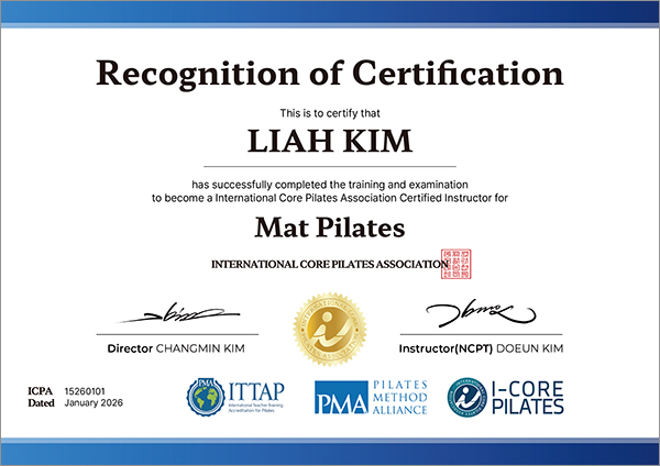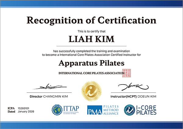 국제코어필라테스협회(I-Core Pilates)는 세계가 인정하는 필라테스 교육 기준, PMA의 ITTAP 인증을 받은 공식 교육기관입니다.